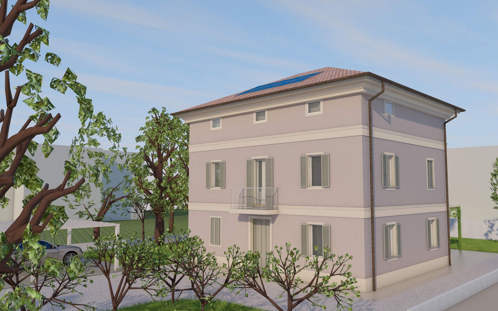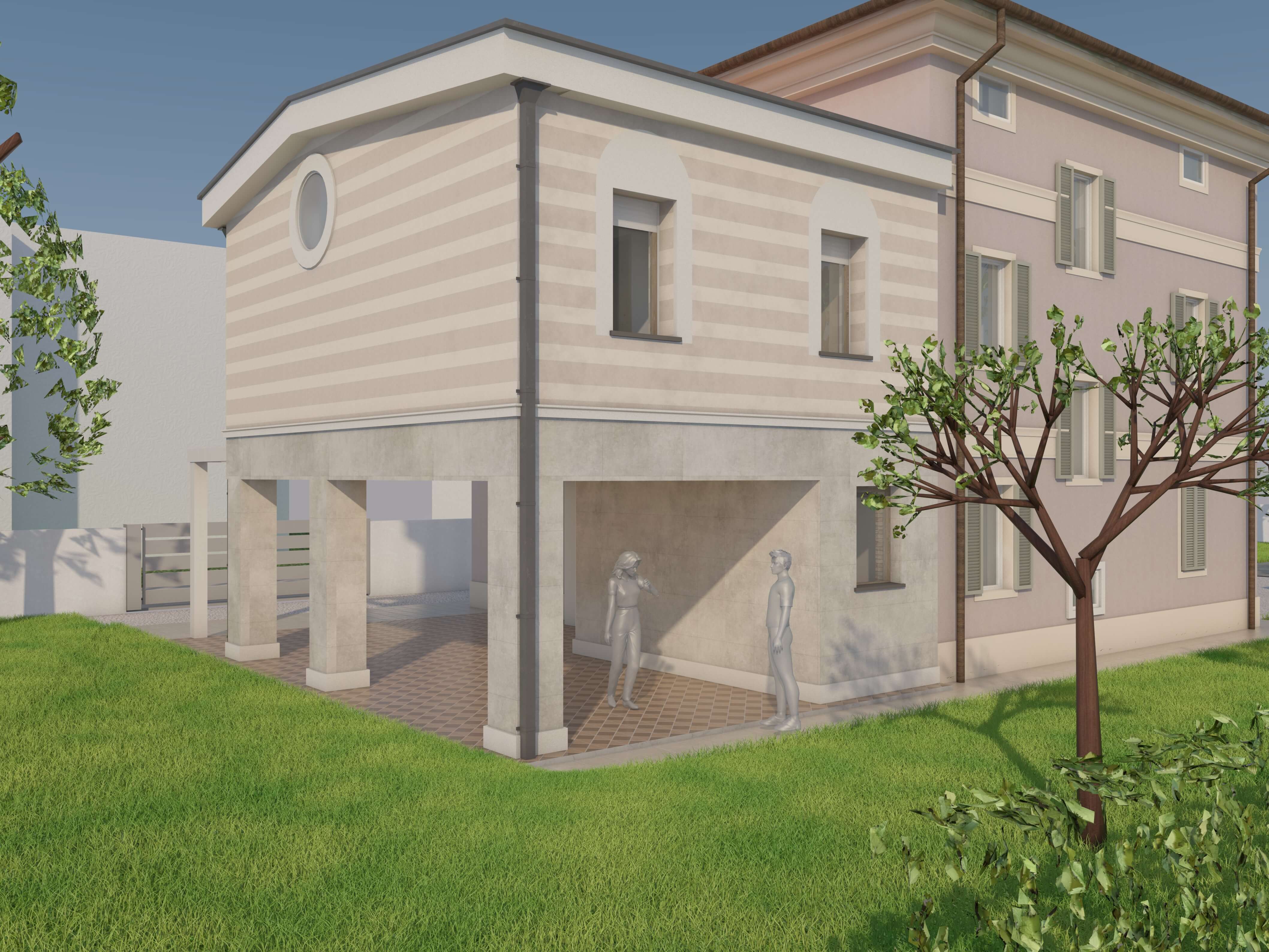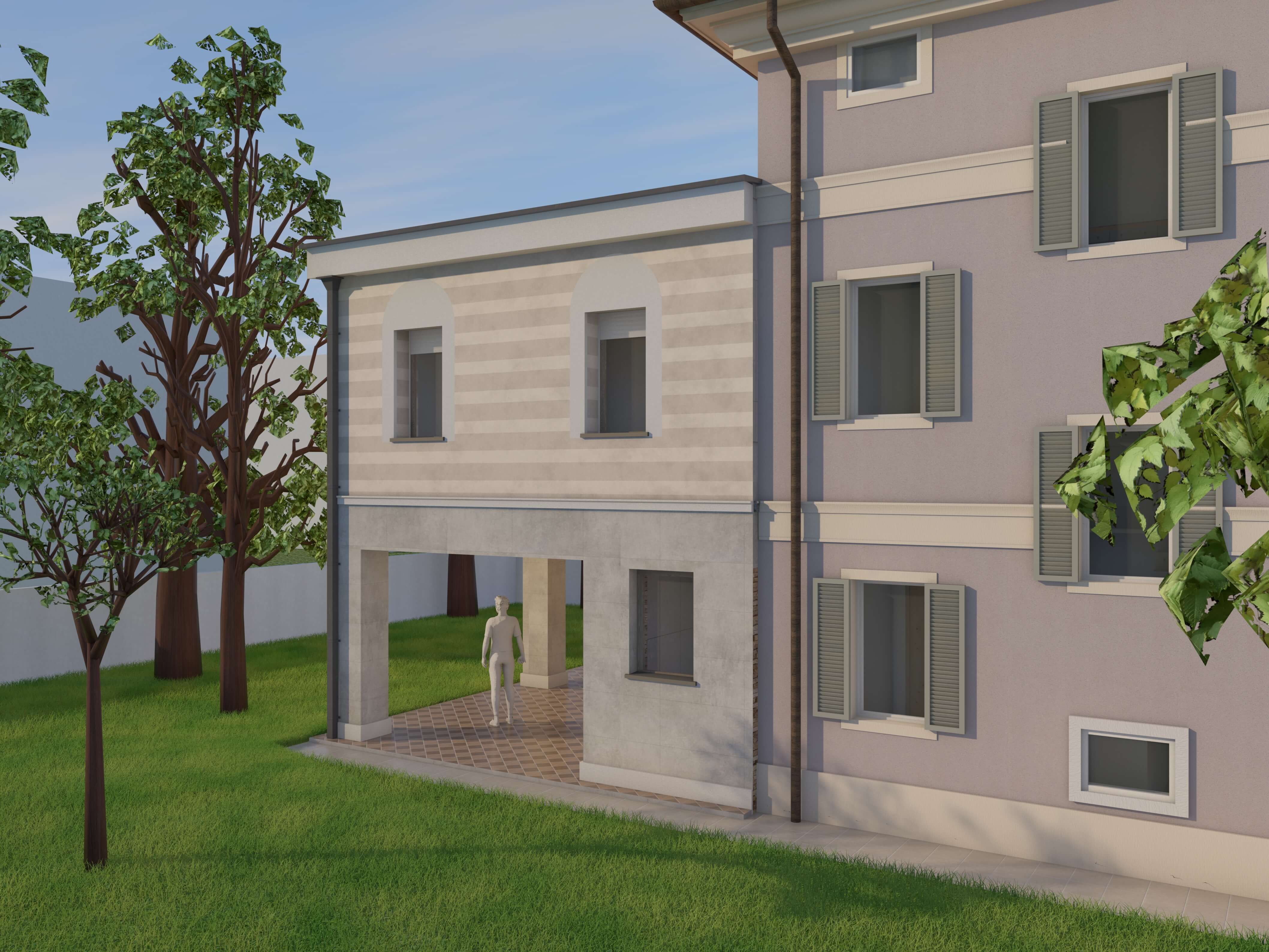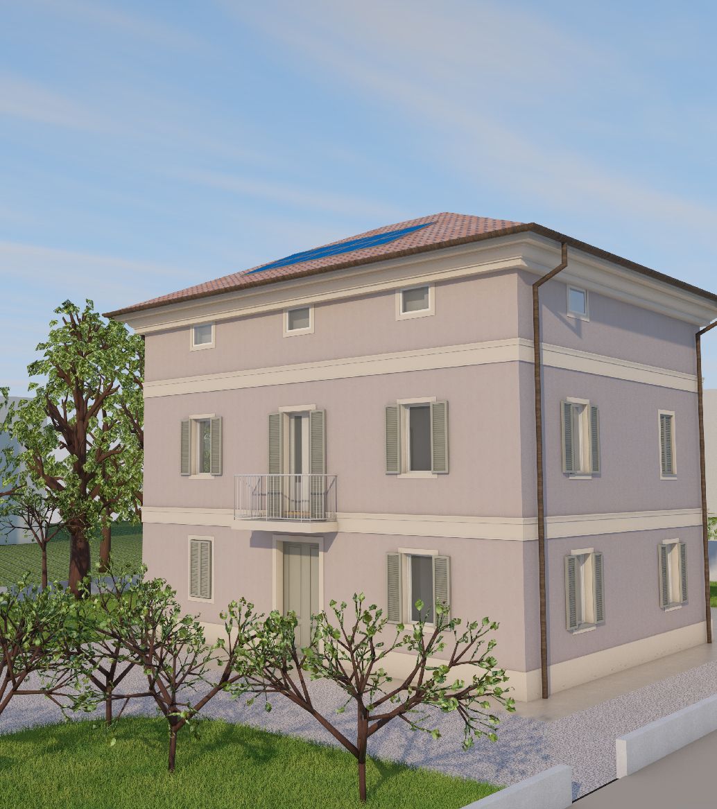 Il corpo principale è oggetto di un restauro e consolidamento globale volto a eliminare le vulnerabilità sismiche e a rendere più confortevoli gli interni; si è scelto di non realizzare un cappotto isolante esterno, per le facciate si è previsto un intonaco naturale a base calce che restituisce con la luce del giorno la morbidezza dei colori, il volume in ampliamento in bicromia sul parco accoglie la camera da letto padronale e crea un nuovo spazio porticato al piano terra rivestito in lastre di gres.