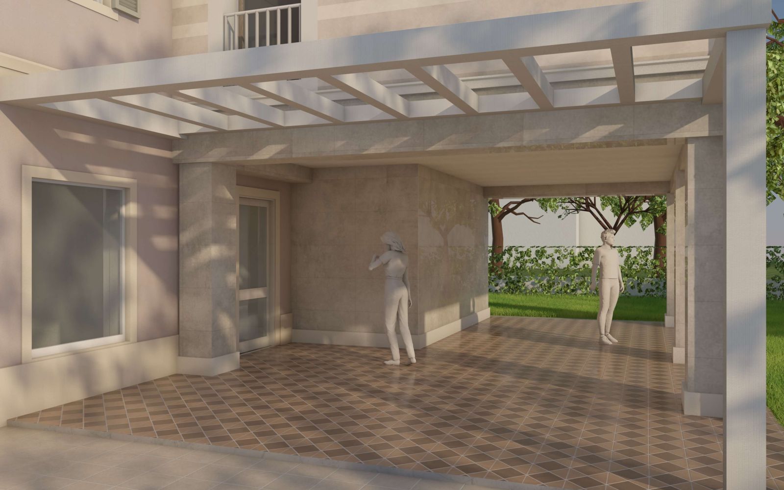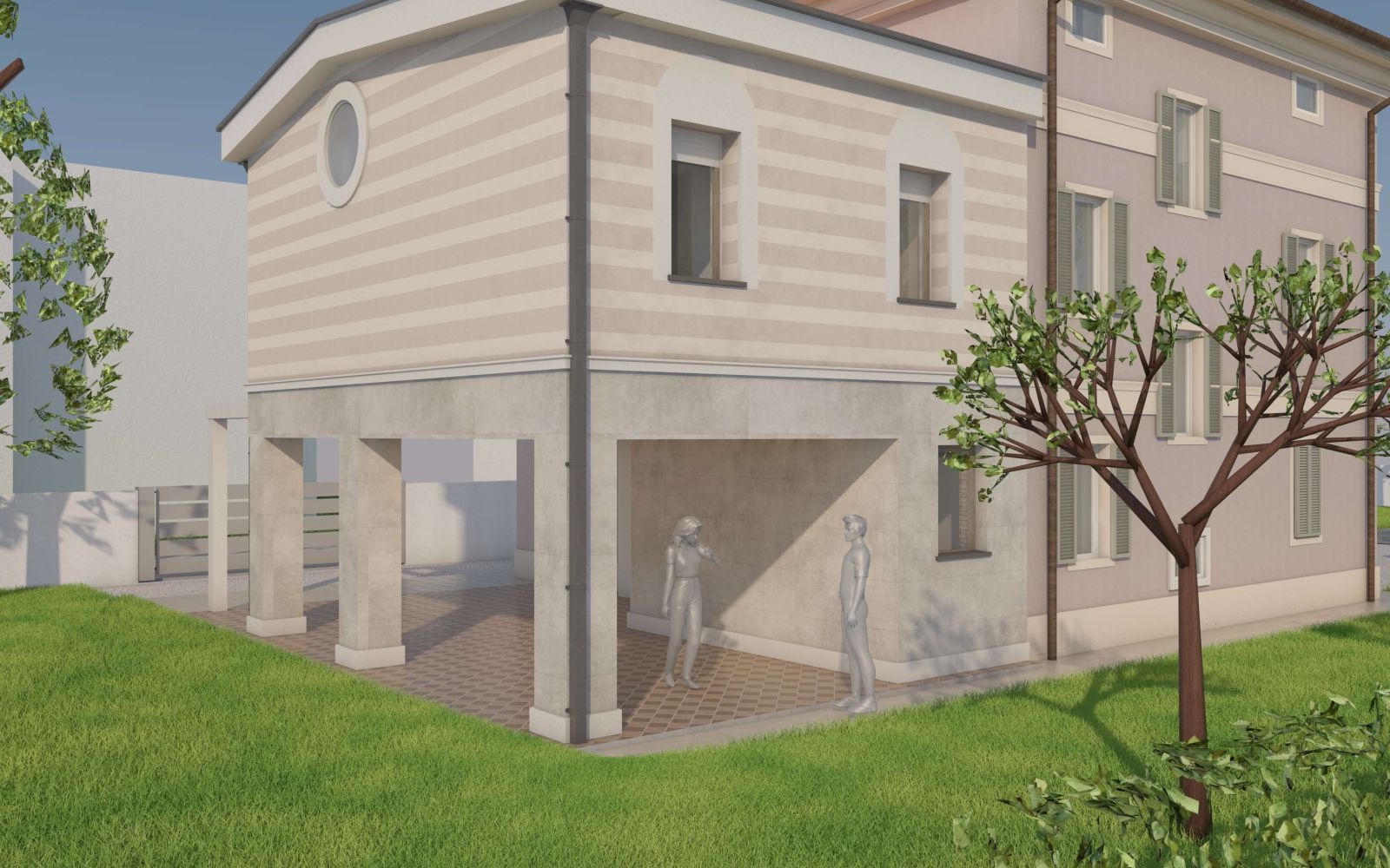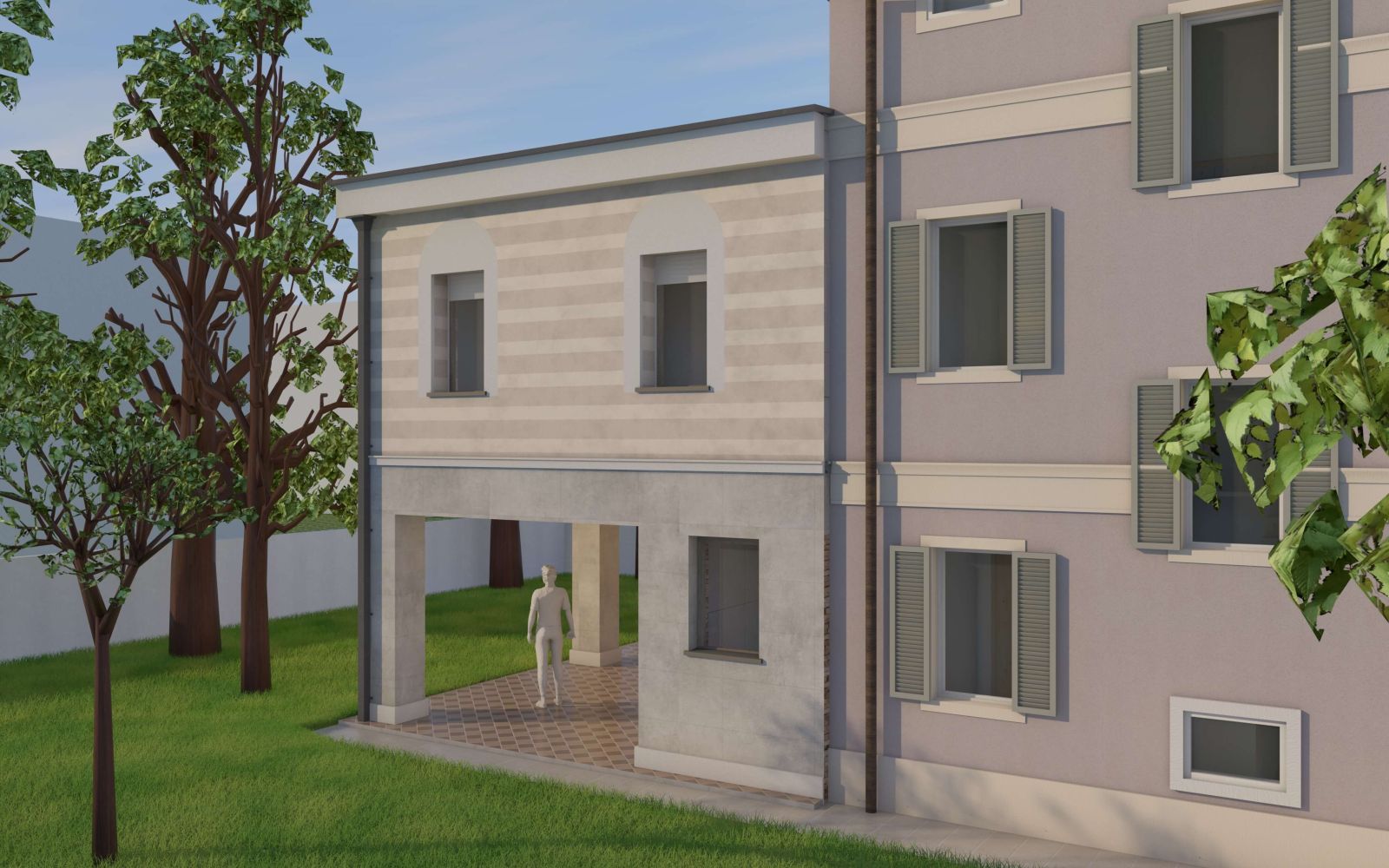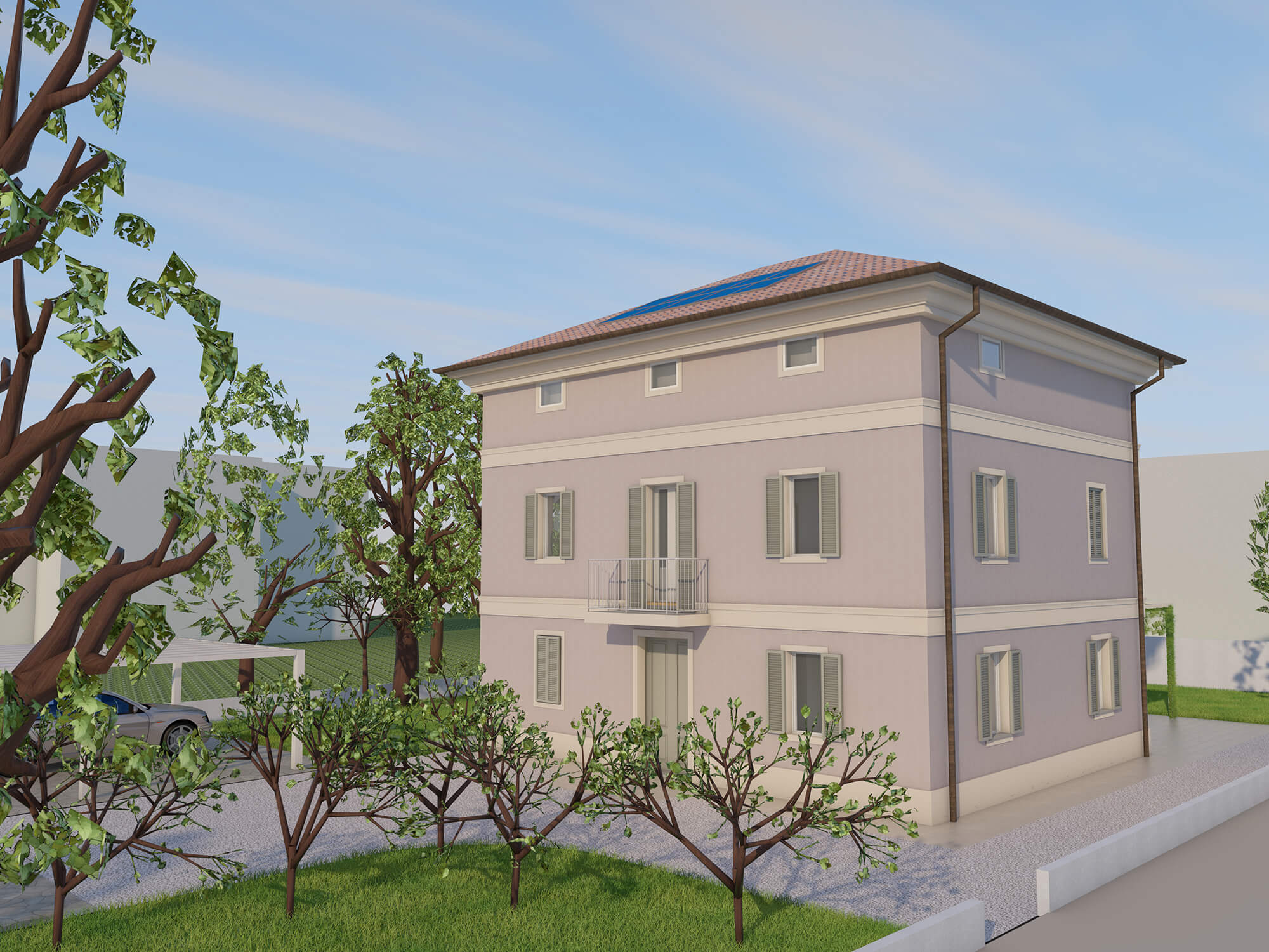 Il corpo principale è oggetto di un restauro e consolidamento globale volto a eliminare le vulnerabilità sismiche e a rendere più confortevoli gli interni; si è scelto di non realizzare un cappotto isolante esterno, per le facciate si è previsto un intonaco naturale a base calce che restituisce con la luce del giorno la morbidezza dei colori, il volume in ampliamento in bicromia sul parco accoglie la camera da letto padronale e crea un nuovo spazio porticato al piano terra rivestito in lastre di gres.